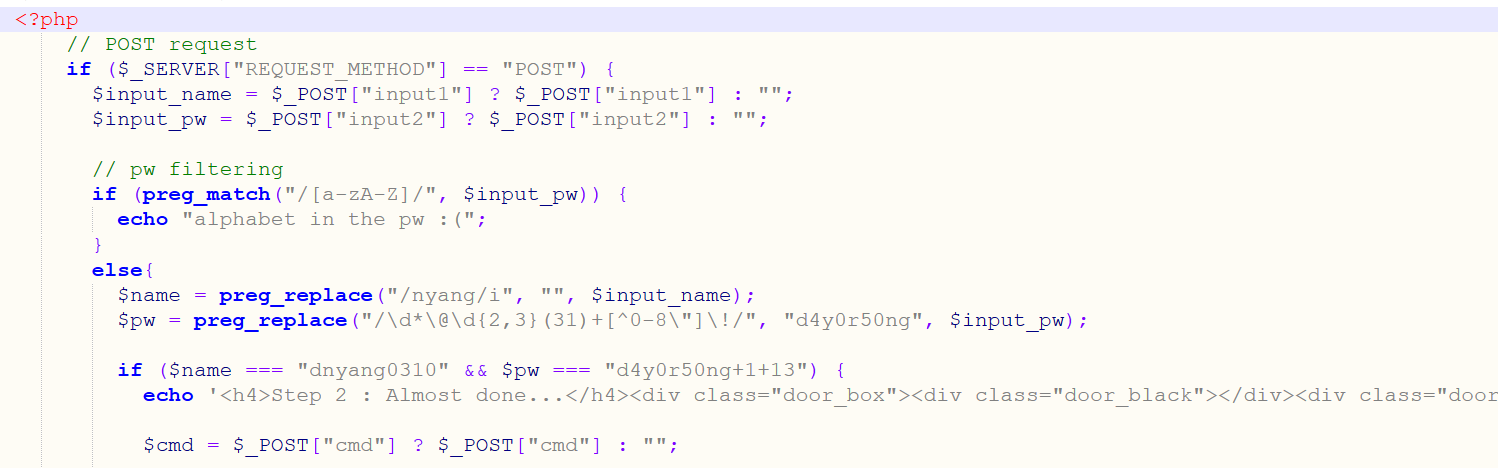 step2.php를 확인하면, 최종적인 닉네임과 패스워드 값이 각각 dnyang0310, d4y0r50ng+1+13이어야 함을 확인할 수 있다.