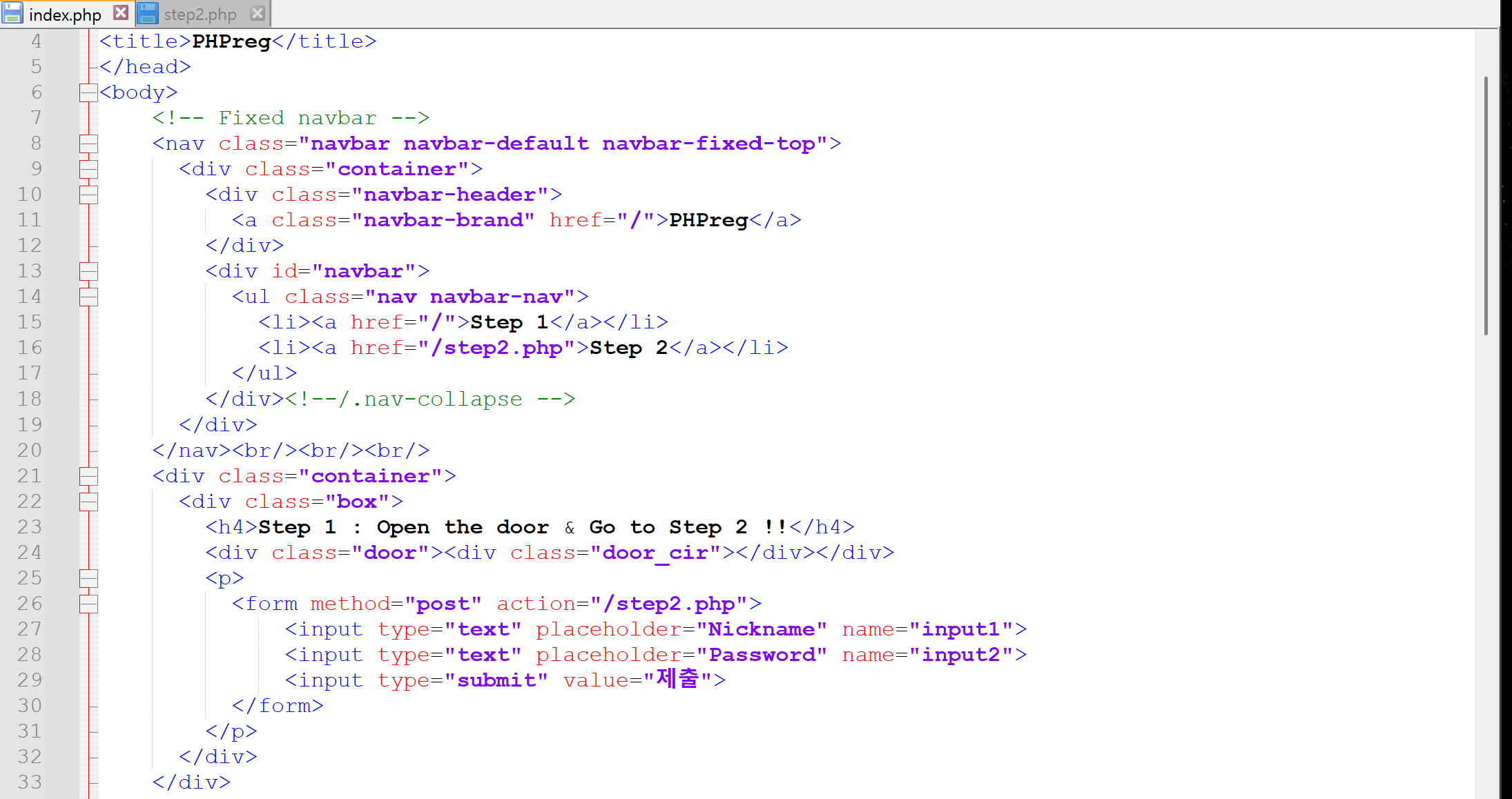 php 파일을 notepad++로 열었다. index.php에는 별다른 게 없었고, 그냥 폼 태그를 이용해 닉네임과 패스워드를 입력받고 step2.php로 넘겨주는 것을 확인할 수 있었다.