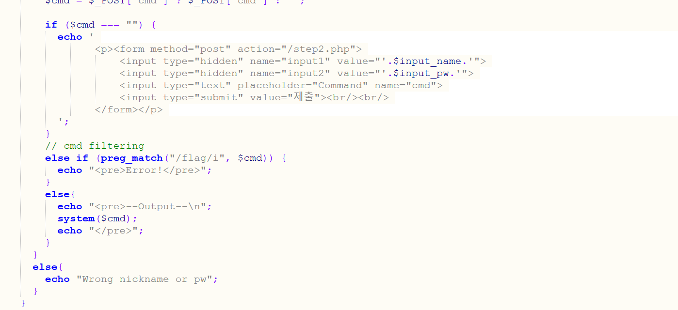 command를 입력하면 system($cmd) 함수로 명령어를 그대로 실행해 출력해주는 것을 확인할 수 있다.
