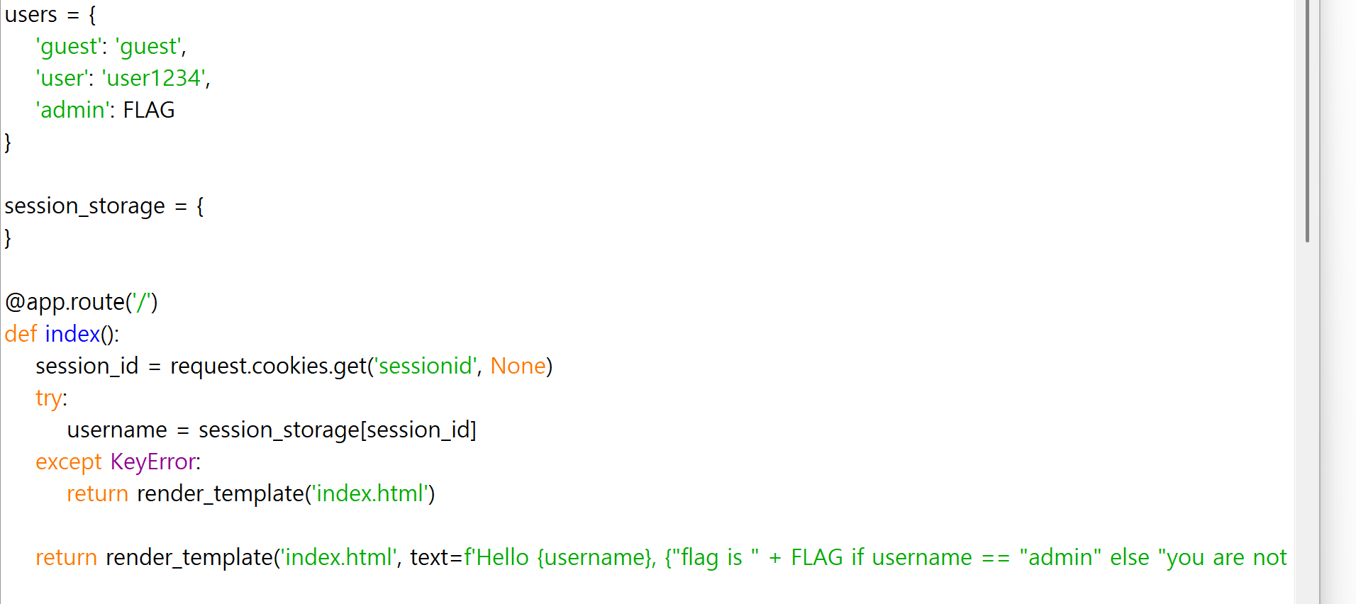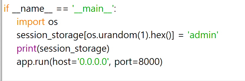 이렇게 나와있고, session storage에서 session_id 인덱스 값으로 username을 찾는다. 그리고 이 username이 admin이 되면 FLAG 값이 출력되는 형태의 코드이다.