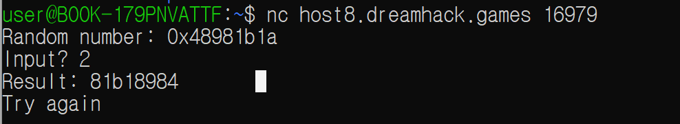 IDA로 주어진 문제 파일 중 chall 파일을 열어서 디컴파일된 코드를 확인했다. 실제로 실행해보면서 코드 기능을 확인해 봤는데, 랜덤 값인 v6과 입력받는 값인 v7을 XOR 연산을 한 후, 그 값을 뒤집은 결과 값을 출력해 주는 듯하다. 그리고 그 결과 값이 0xa0b4c1d7과 같으면 flag를 얻을 수 있을 것 같다.